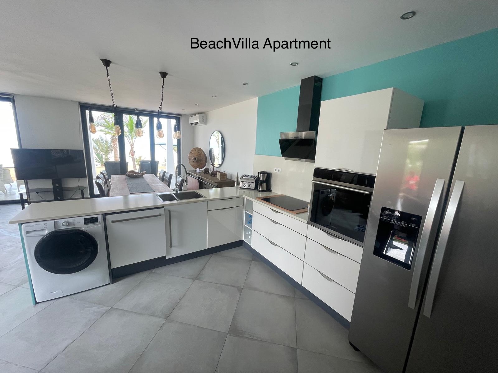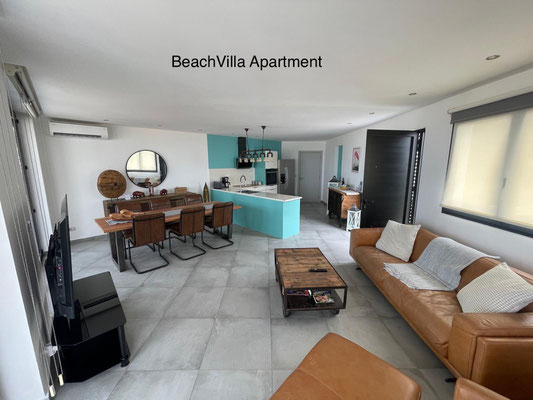 Unser BeachVilla Apartment besticht durch den großzügigen Wohn-, Koch- und Essbereich mit allem, was man zum leben braucht. Die vollausgestattete Küche mit Spülmaschine, Spüle, Kaffee Maschine, Wasserkocher, Toaster, Kochutensilien wie Töpfe, Pfannen und diverses Kochbesteck.
