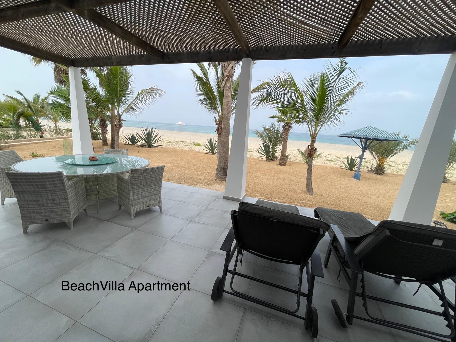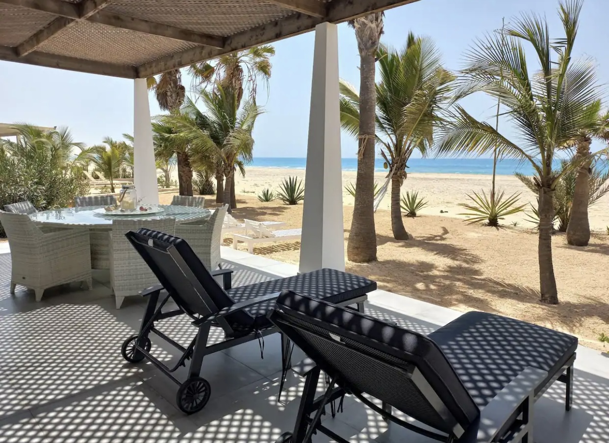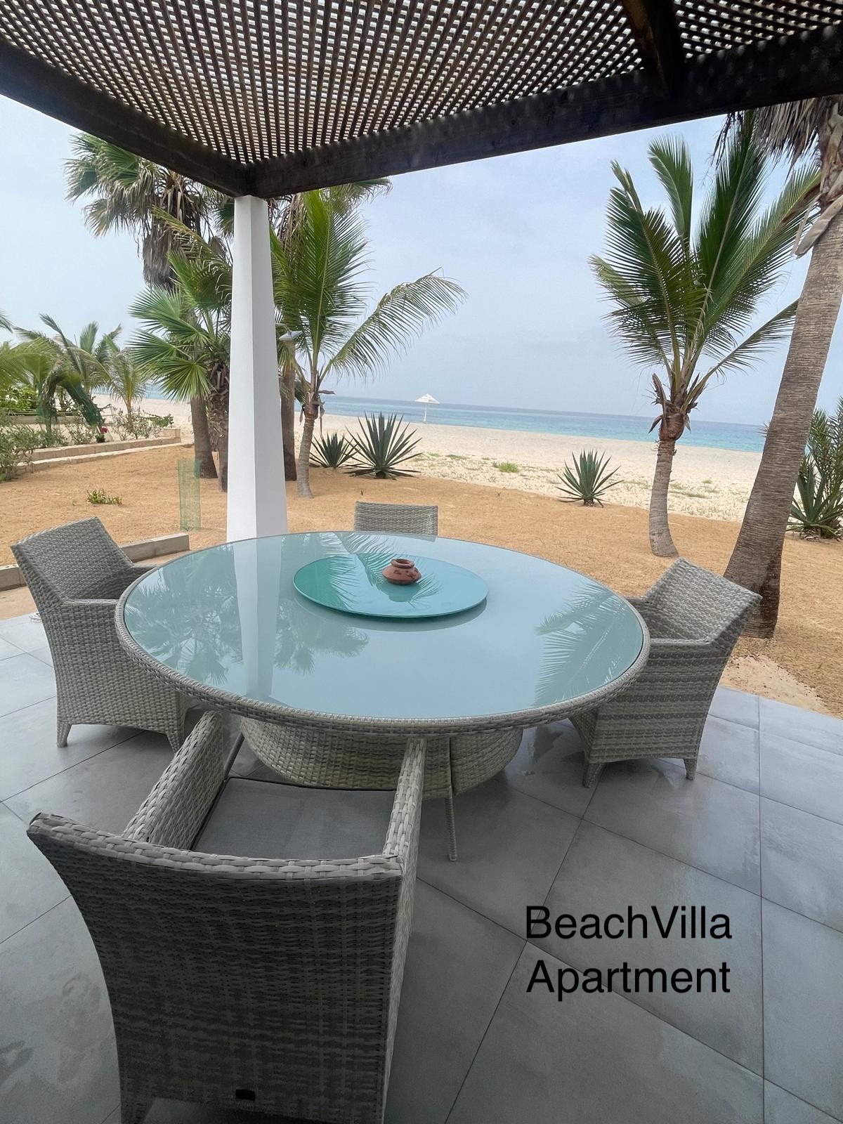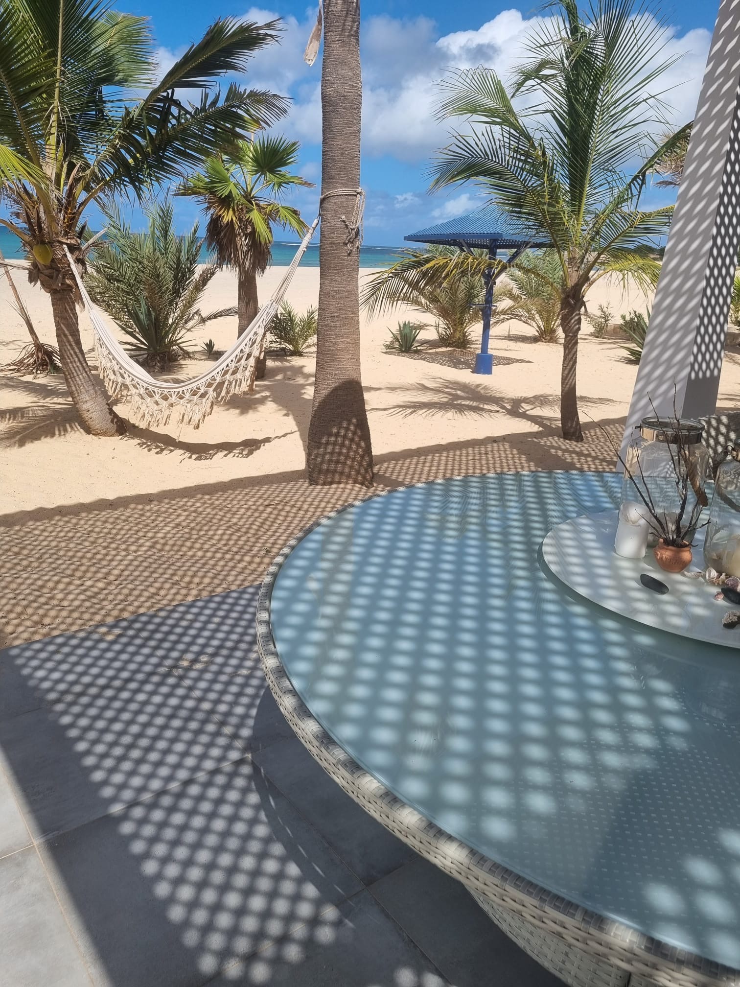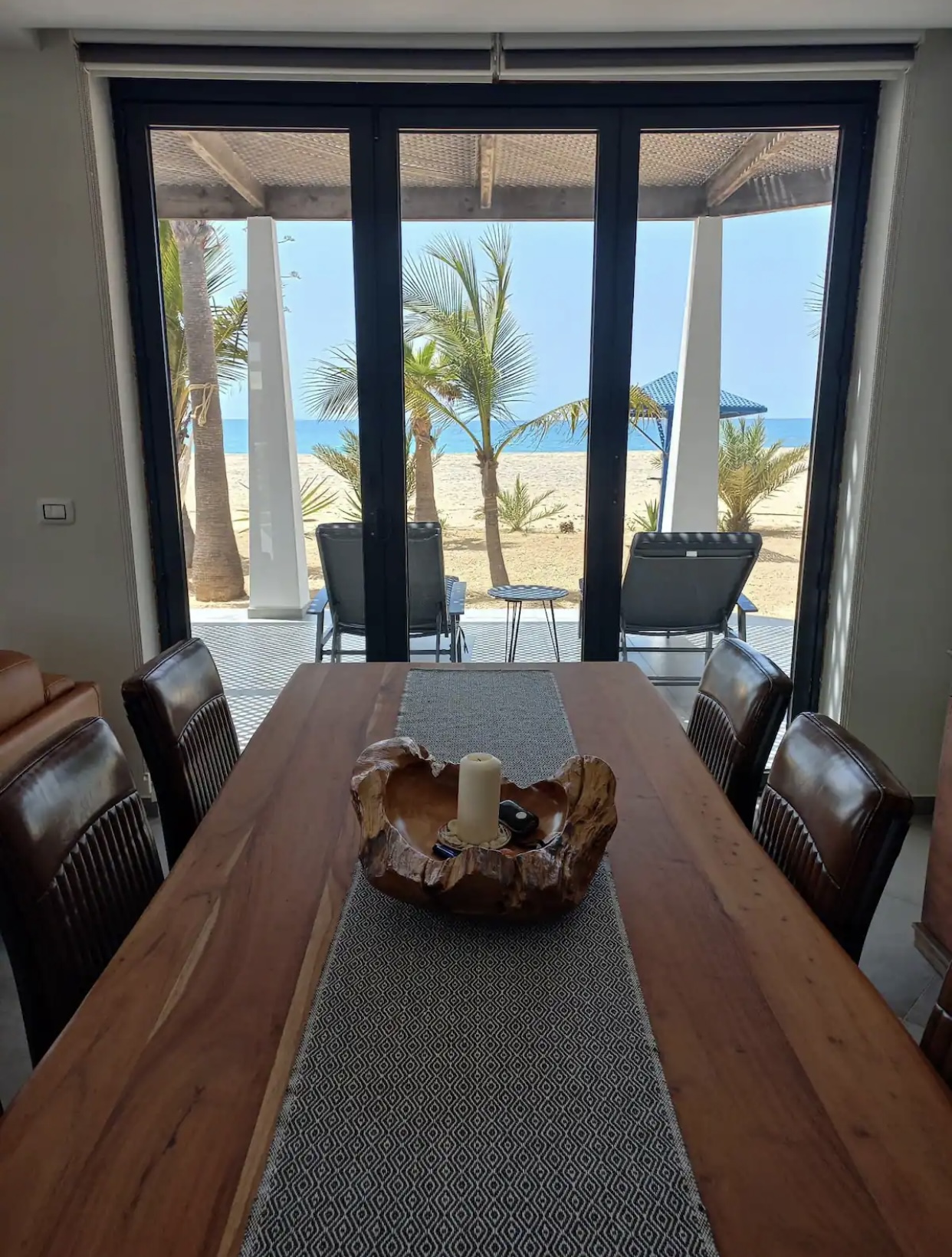 Auf der Terrasse mit direktem Strandzugang haben wir für Sie einen Tisch mit Stühlen bereitgestellt, an dem Sie morgens Ihr Frühstück serviert bekommen.